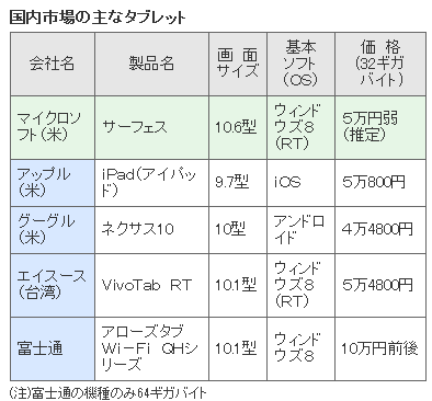 日本で発売するサーフェスは「ウィンドウズ8」の1品種である「RT」版を搭載する見通し。
