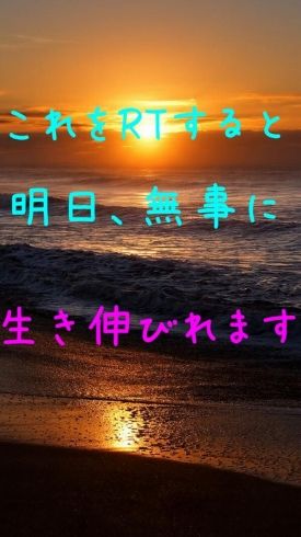 挙げ句の果てには、「これをRTすると 明日、無事に生き伸びれます」などという画像まで出回る。夕焼け時の波打ち際の写真に、上記の文章を記しただけのものだが、この2日間で1万人以上がリツイートする始末だ。