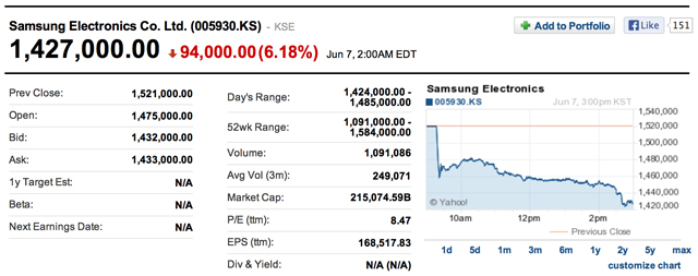 同件はReutersなどが報告している。7日終了時点のSamsung株価(005930.KS)は142万7000ウォン(KRW)で(http://finance.yahoo.com/q?s=005930.KS)、前日比6.18%マイナスとなった。