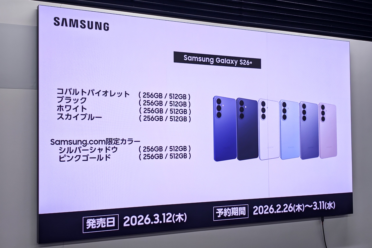 サムスン電子ジャパンは、最新のAndroidスマートフォン「Samsung Galaxy S26+」を発表した。価格は16万9920円~、3月12日に発売される。
