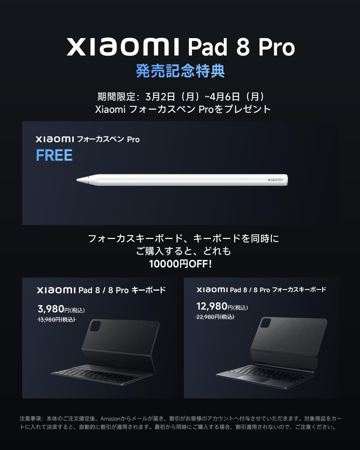 シャオミ・ジャパンは、Androidタブレット「Xiaomi Pad 8」シリーズを発売した。価格は「Xiaomi Pad 8」が7万4980円、「Xiaomi Pad 8 Pro」が8万9980円~。公式サイトやXiaomi Store、Amazon.co.jpなどで購入できる。あわせて、対応するペンや専用キーボードなどのアクセサリーも販売を開始した。